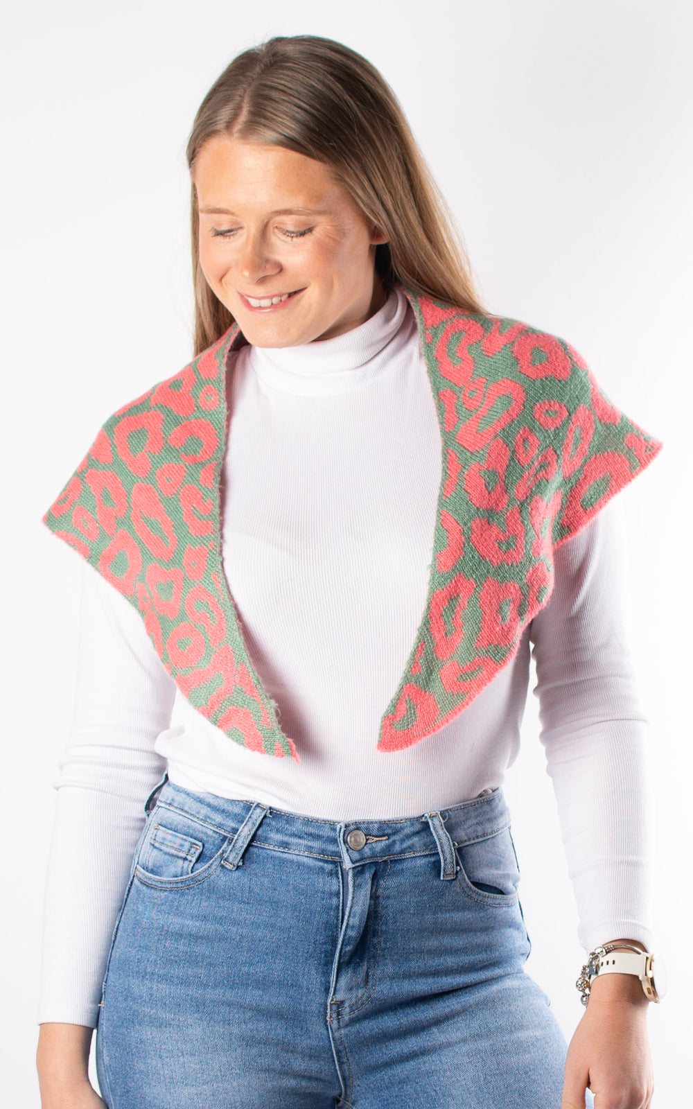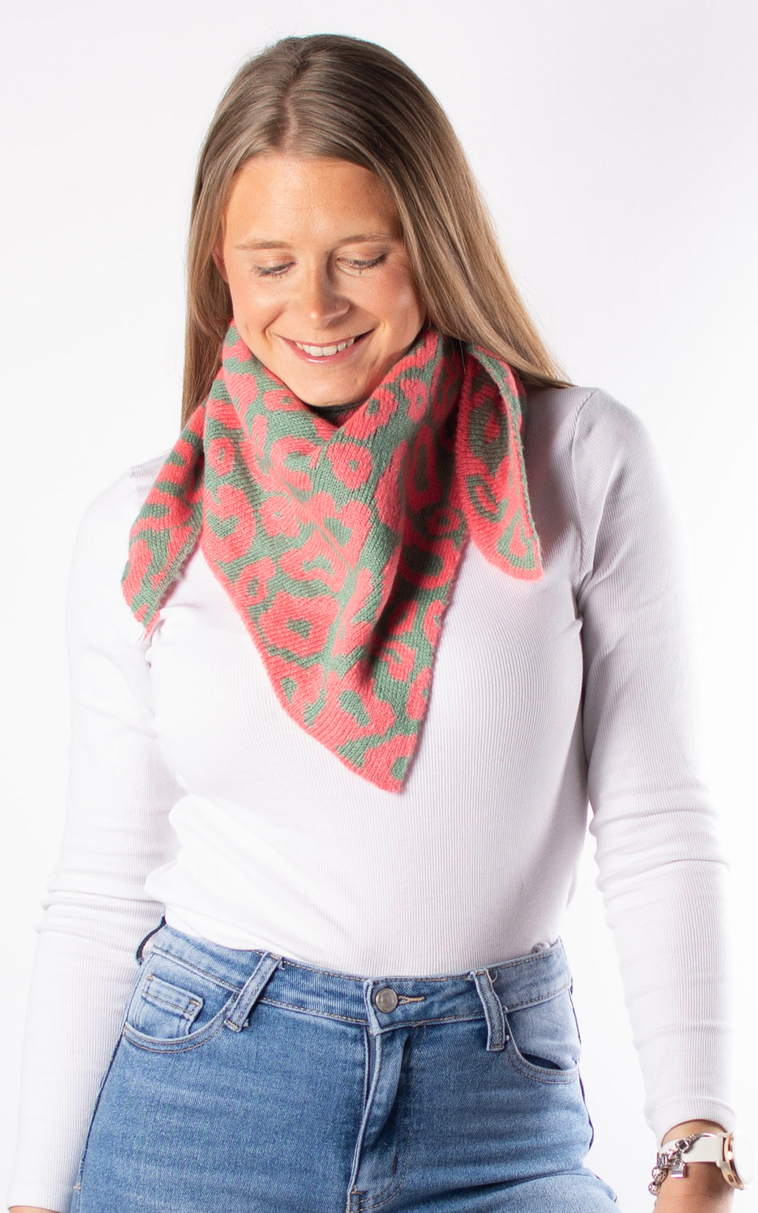 Knitted Triangle Scarf | Leopard |Pink & Green