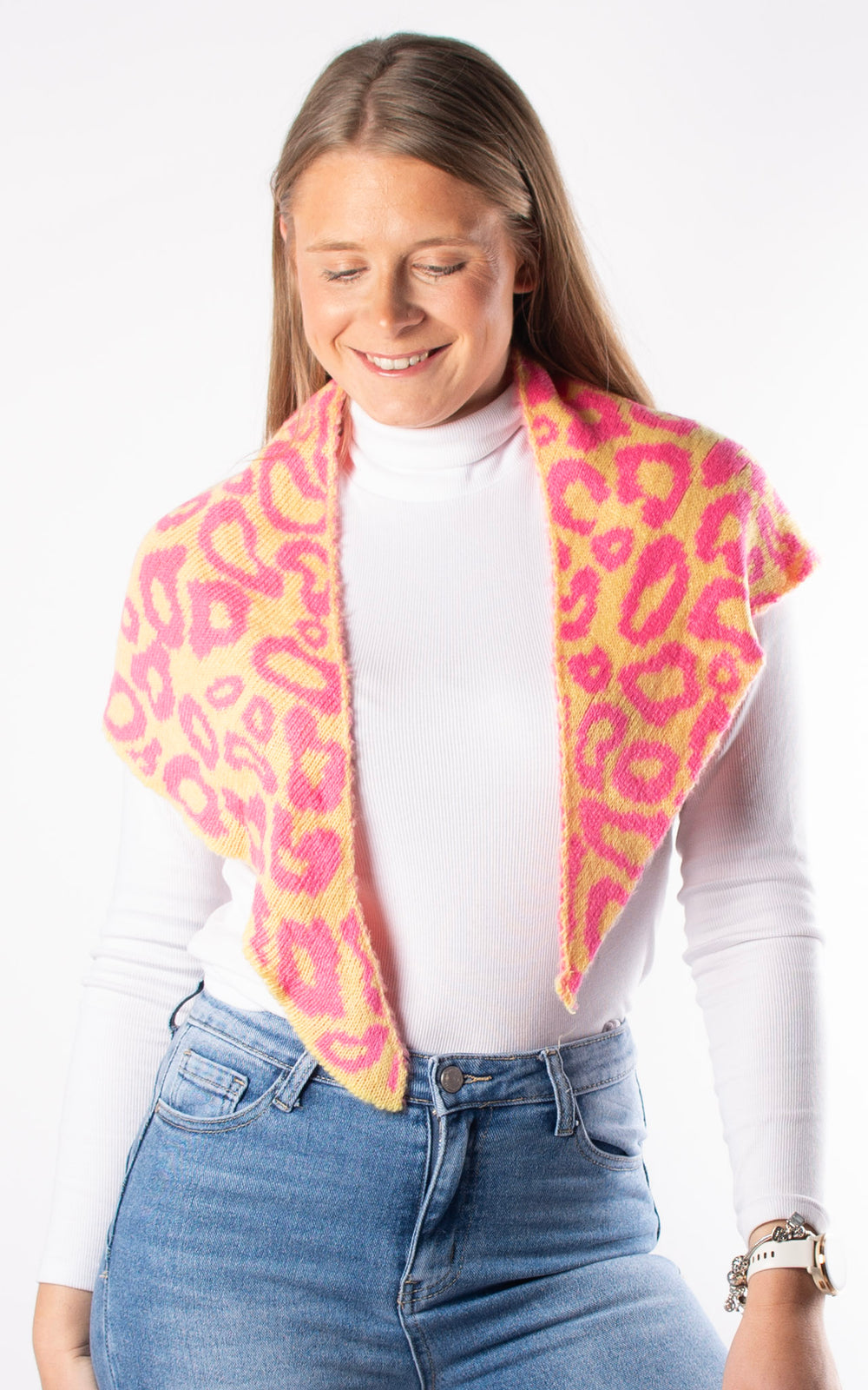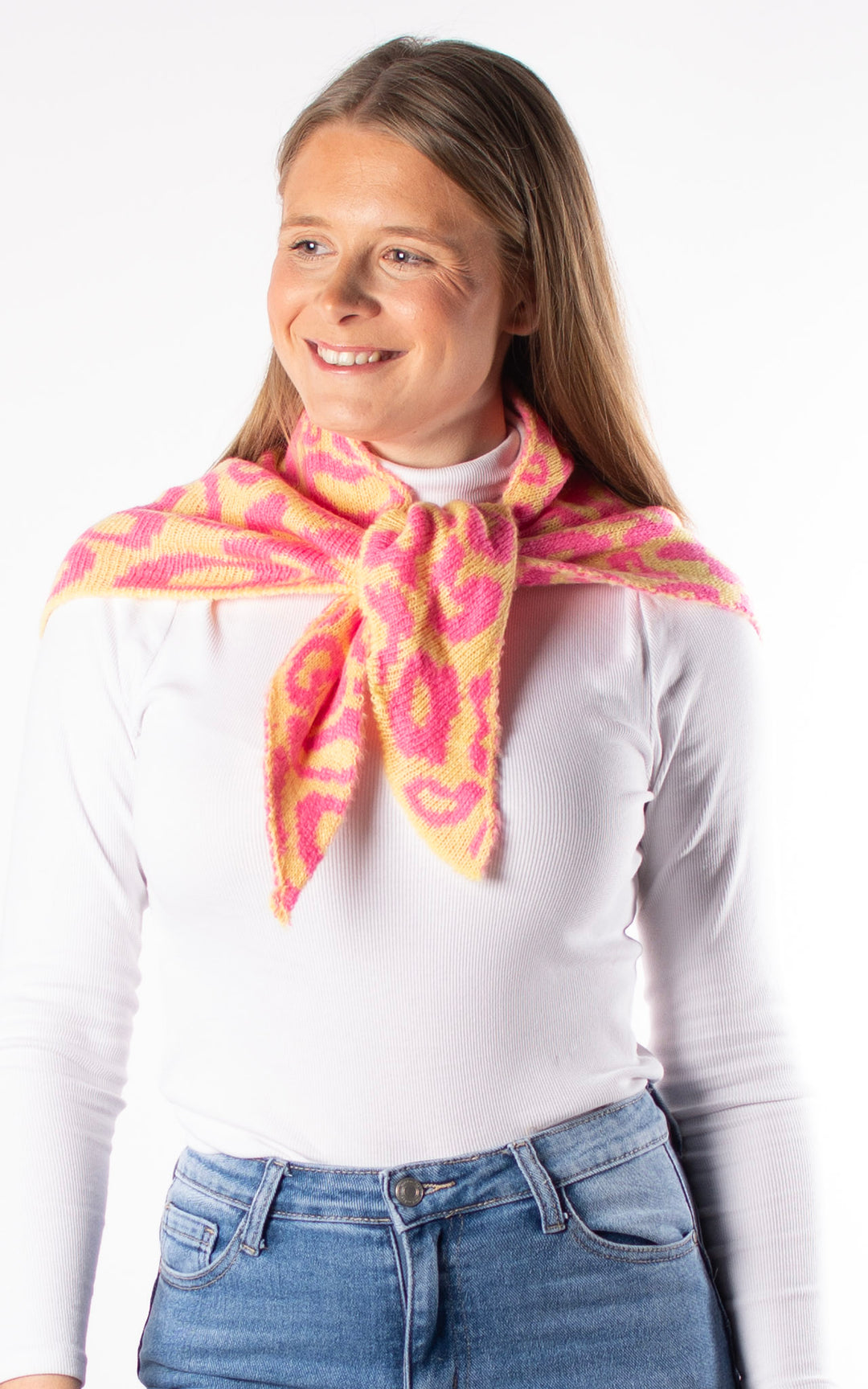 Knitted Triangle Scarf | Leopard |Pink & Yellow