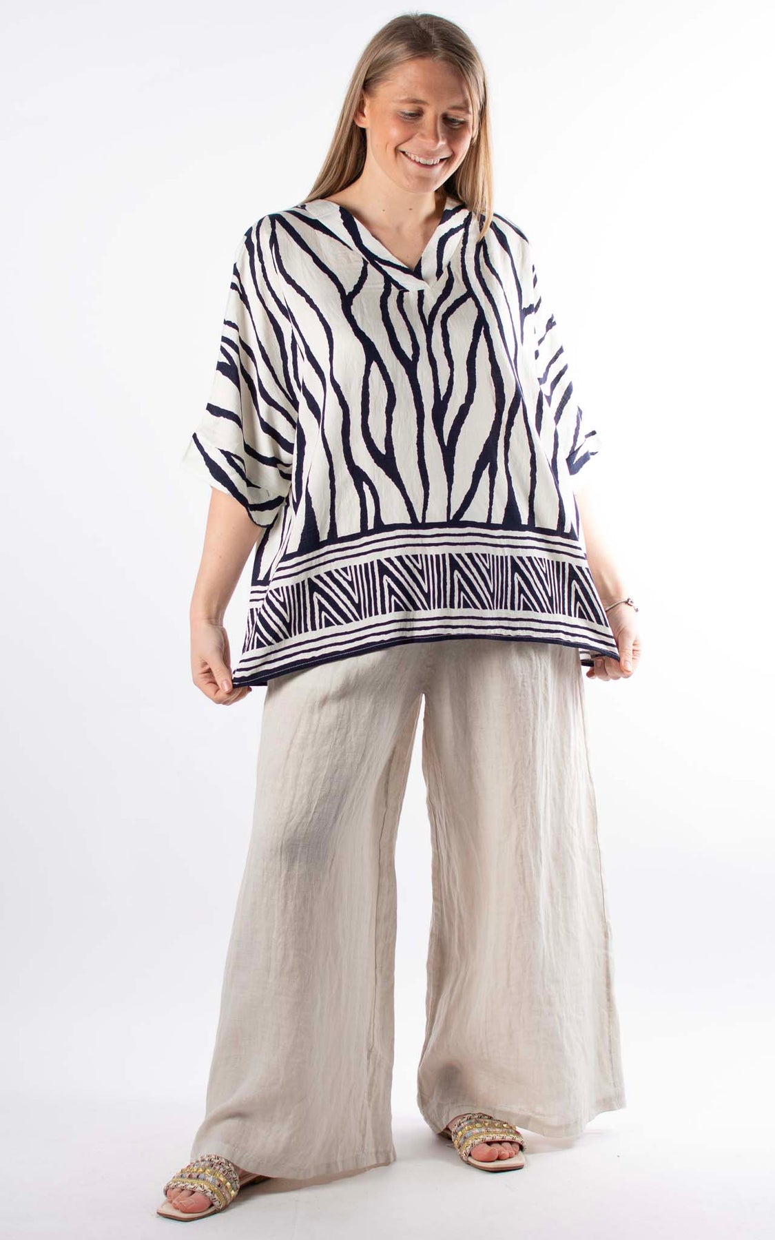 Meet your new warm-weather wardrobe staple. The Palma Zebra T is an effortlessly cool style that works as hard as you do — dressed up with linen trousers or kept casual with your favourite shorts. Cut in a relaxed, easy-wearing silhouette, this beautiful navy top is crafted from a premium blend of viscose, cotton, and linen — a combination that feels cool and breathable against the skin while draping beautifully on every figure.
